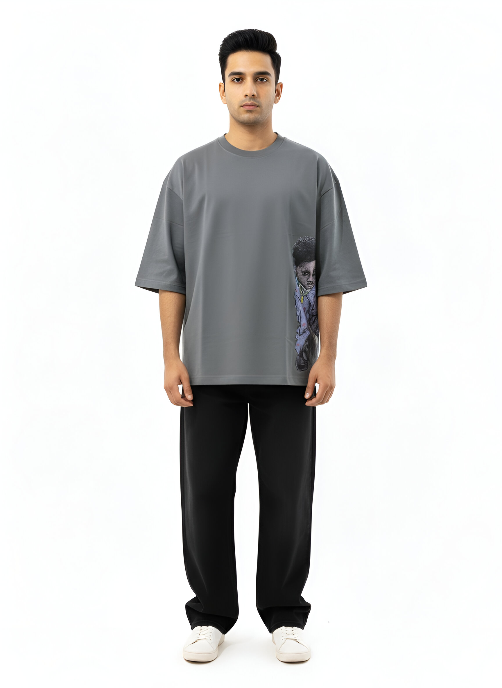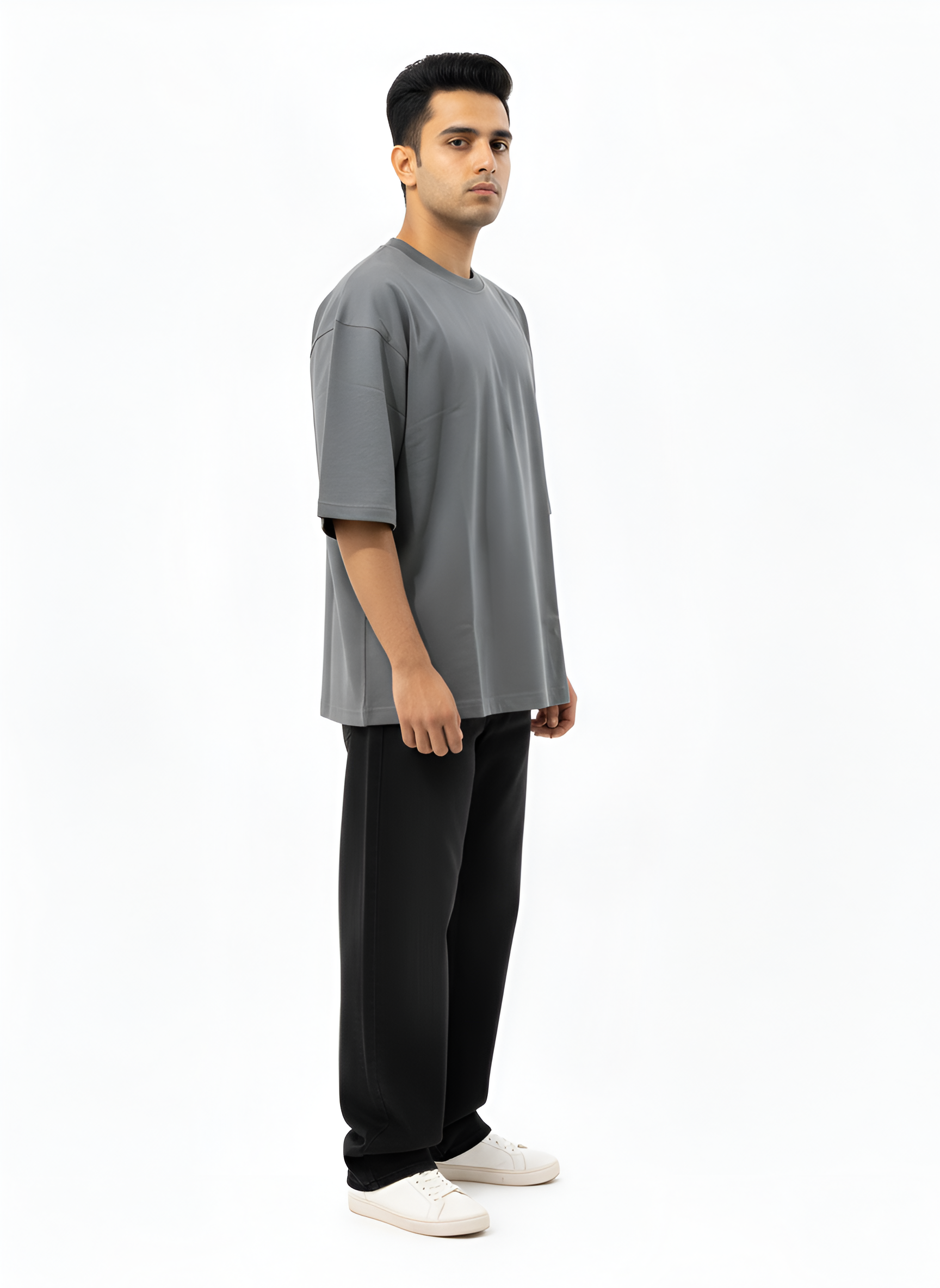 Composition: 100% cotton GSM: 260 Color: Steel Grey Country of Production: India Wash care: Machine wash cold with similar colors. Only non-chlorine. Tumble dry low. Warm Iron if needed. Sizing: Garment measurement in inches. Sleeve length: Short Sleeve Neckline: Round Neck Fit: Oversized Tee